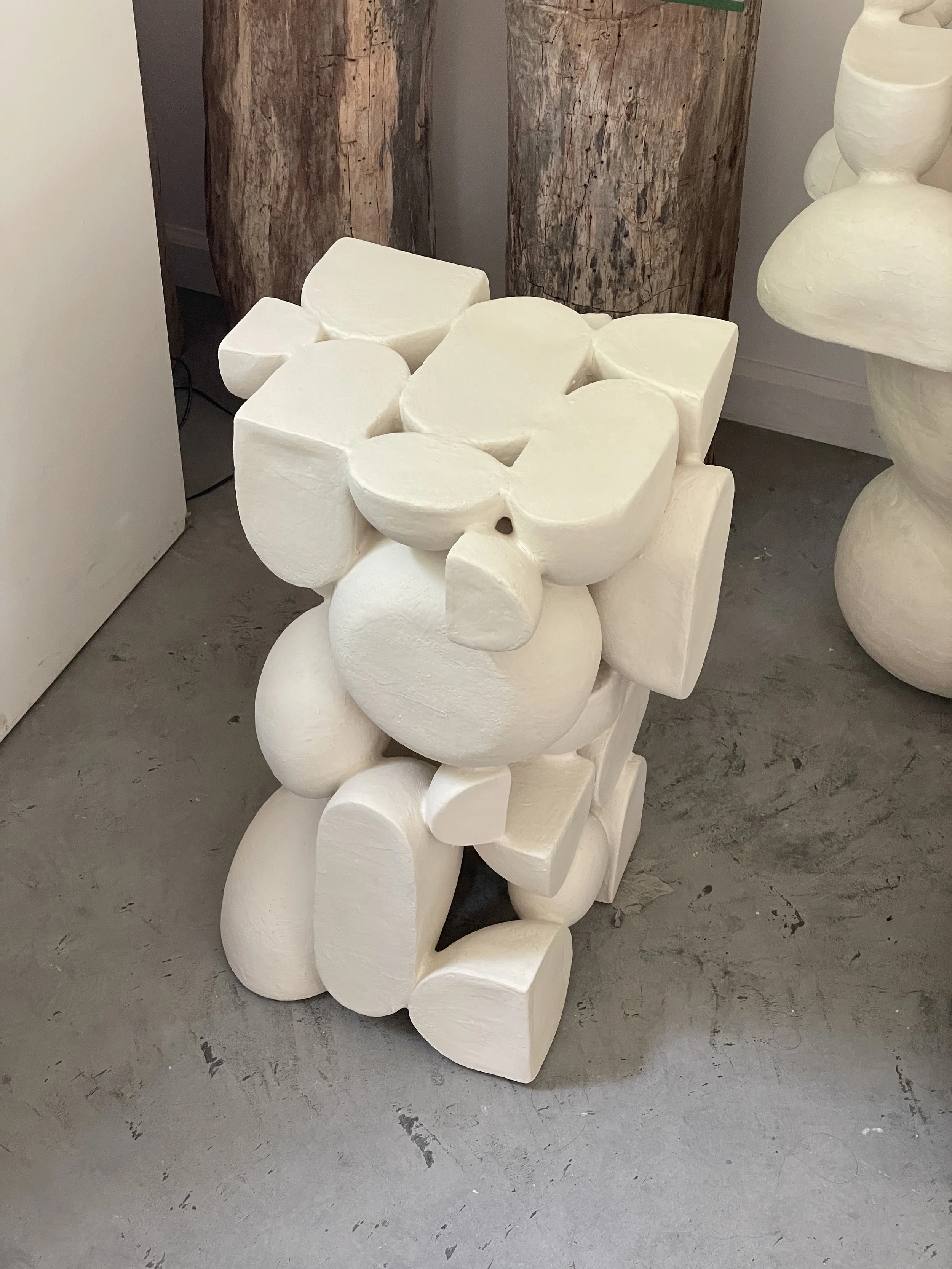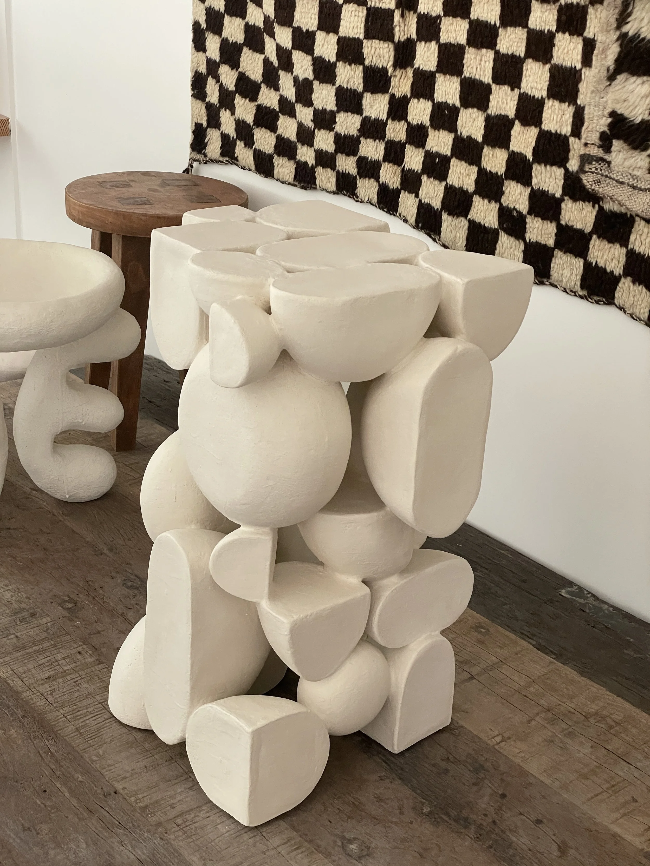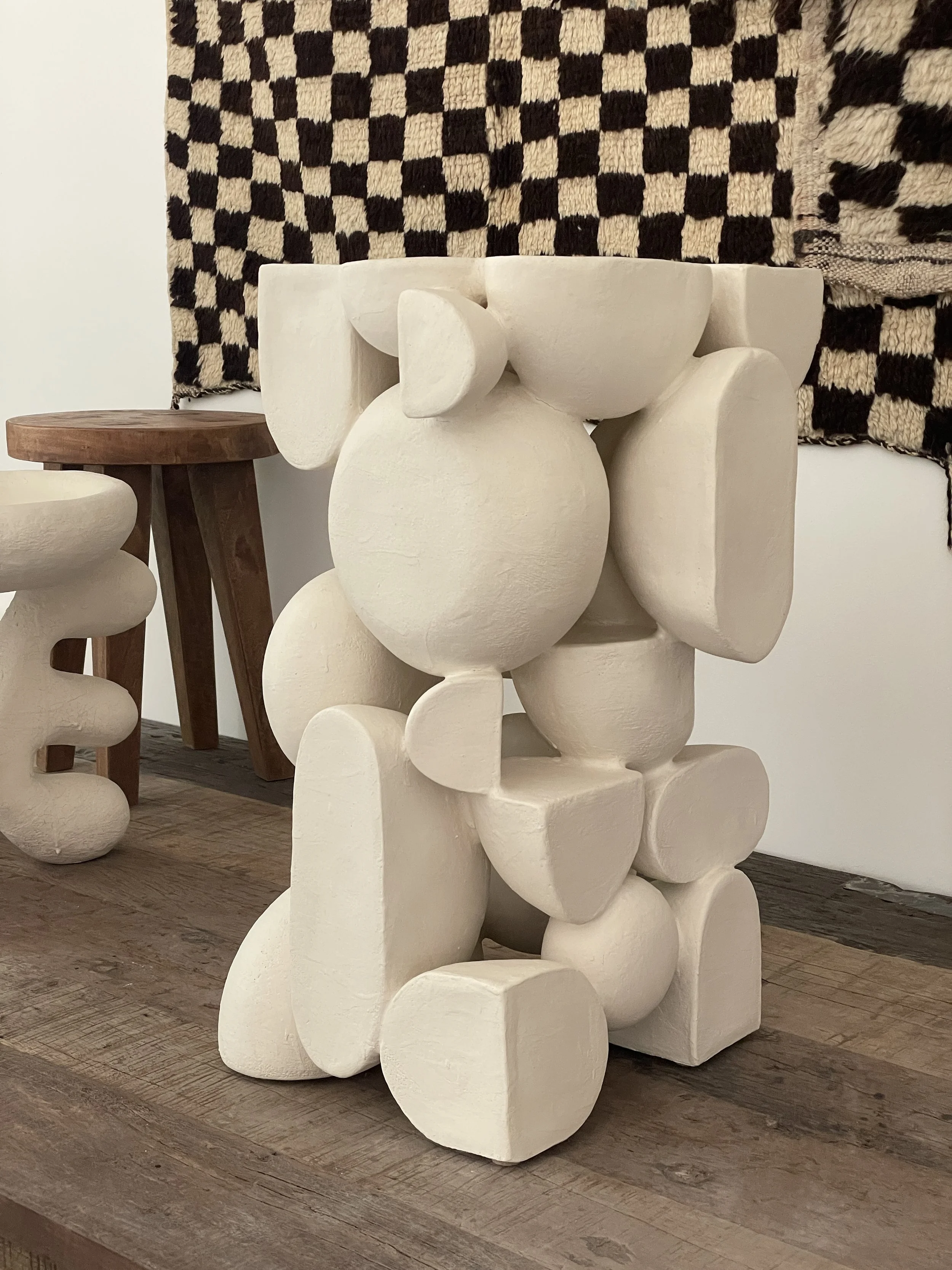 This sculpture is a unique assembly of individually rolled out slabs, carefully slow dried to bone dry state, finished with multiple layers of brushed-on slip on the surface and glazed inside. A piece may be kiln fired once or twice to reach the desired surface texture. Minor flaking may occur due to the nature of the material.